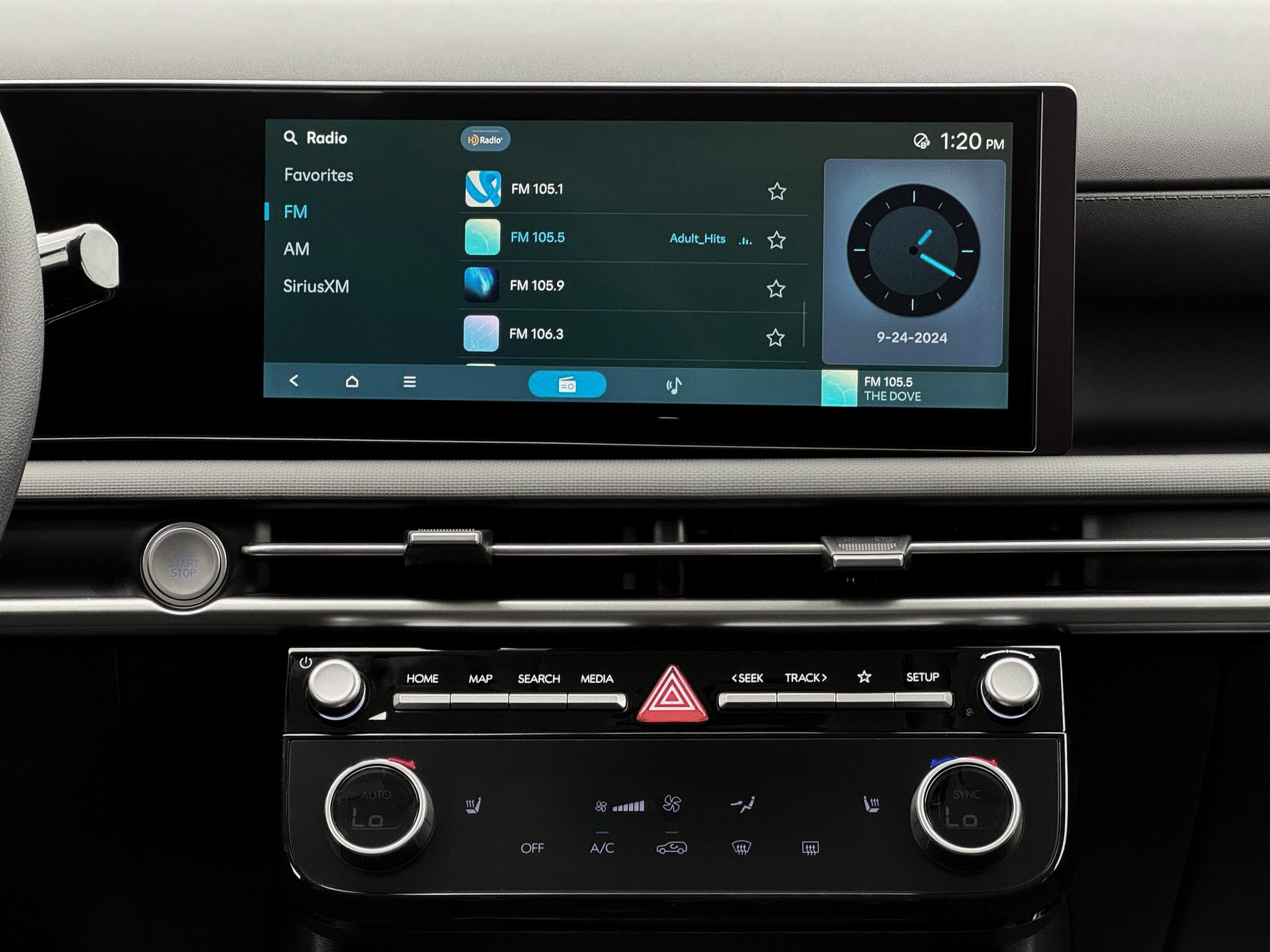 - Radio: AM/FM/HD Audio System -inc: 12.3" color touchscreen display, 6 speakers, SiriusXM satellite radio system (3-month trial subscription), wireless Apple CarPlay and Android Auto integration, controller OTA update capability, Blue Link connected car system and USB connectivity