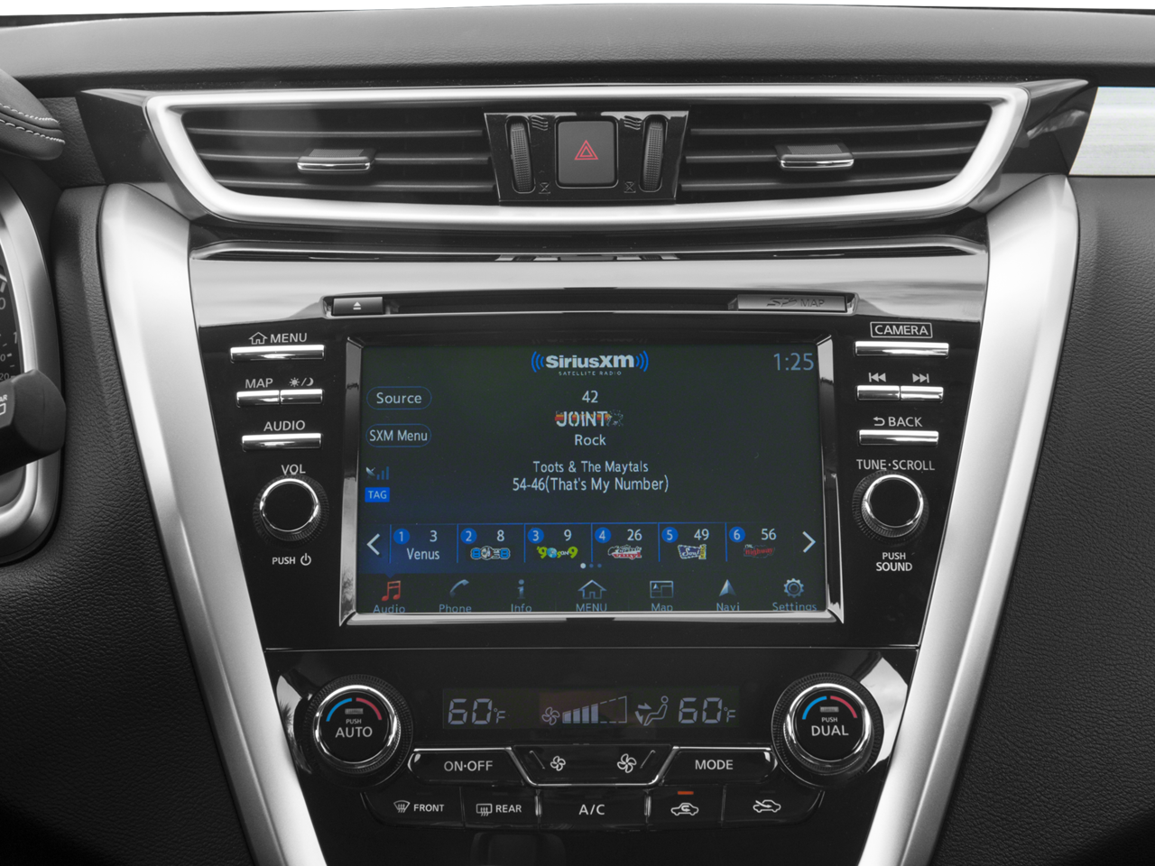 - Radio: AM/FM/CD Audio System w/Navigation -inc: 6 speakers, auxiliary audio input jack, SiriusXM satellite radio, 8" color display w/multi-touch control, voice recognition for navigation and audio, HD Radio, SiriusXM Traffic, SiriusXM Traffic Link, front and rear USB port, Bluetooth® hands-free phone system, streaming audio via Bluetooth®, hands-free text messaging assistant, NissanConnect w/navigation and Apple CarPlay