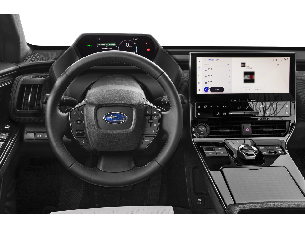 - Radio: Subaru Solterra Connect 12.3" Multimedia System -inc: navigation system (navigation subscription required), AM/FM HD radio, Bluetooth® audio streaming and hands-free phone connectivity w/SMS text messaging (refer to subaru.com for cell phone compatibility), SiriusXM all access radio (4 months free trial included/subscription required after), Android Auto, Carplay and harman/kardon 11 speaker system w/576 watt equivalent maximum output amplifier, multi-touch gesture high resolution display screen, Near Field Communication (NFC), Subaru Solterra Connect intelligent assistant includes dual-zone voice control system w/driver and passenger headliner microphone, steering wheel talk switch, cloud navigation operation, integrated steering operation (subscription required), USB/Over The Air (OTA) audio system updates, USB/Map Over The Air (MOTA) navigation system updates, steering wheel control switches for audio system and Bluetooth®, USB A input/charge port and illuminated dual USB C input/charge port